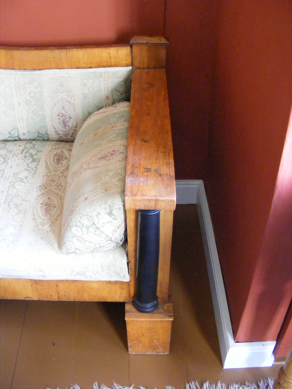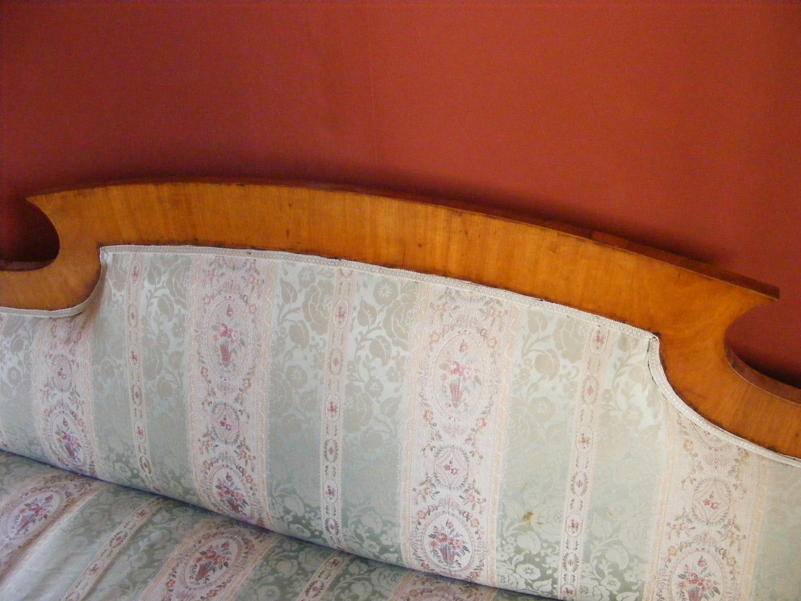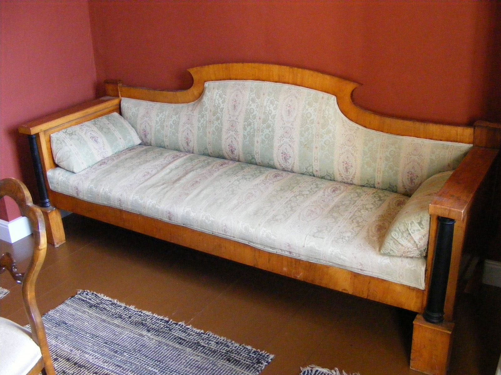 Biedermeier sohva. Valmistettu noin 1820. Sohvan takana valmistajan etiketti. Sohvassa kauniit mustat pilasterit sekä muut tyylipuhtaat biedermeier koristeet. Pituus noin 230 cm.